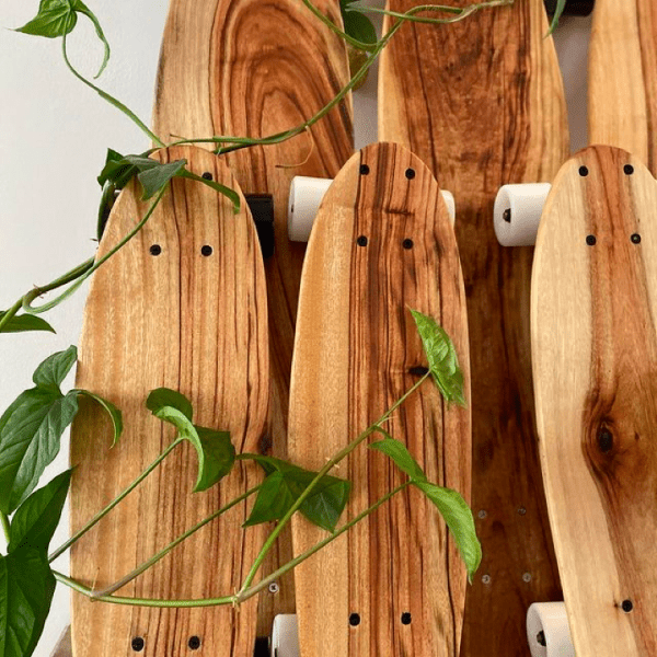 Our skateboards are handcrafted using camphor trees sourced from a nearby farm located in the vicinity of Nimbin, a hippy town. The farm has its own mill and stockpiles of pre-cut logs accumulated over the years. These logs are transformed into planks suited for skateboards, which are then manually crafted using heavy machinery to thin the planks to an appropriate thickness. The planks are shaped according to three templates: penny, cruiser, and longboards. The boards' edges are sanded, and they are oiled to enhance the grain, patterns, and colors.